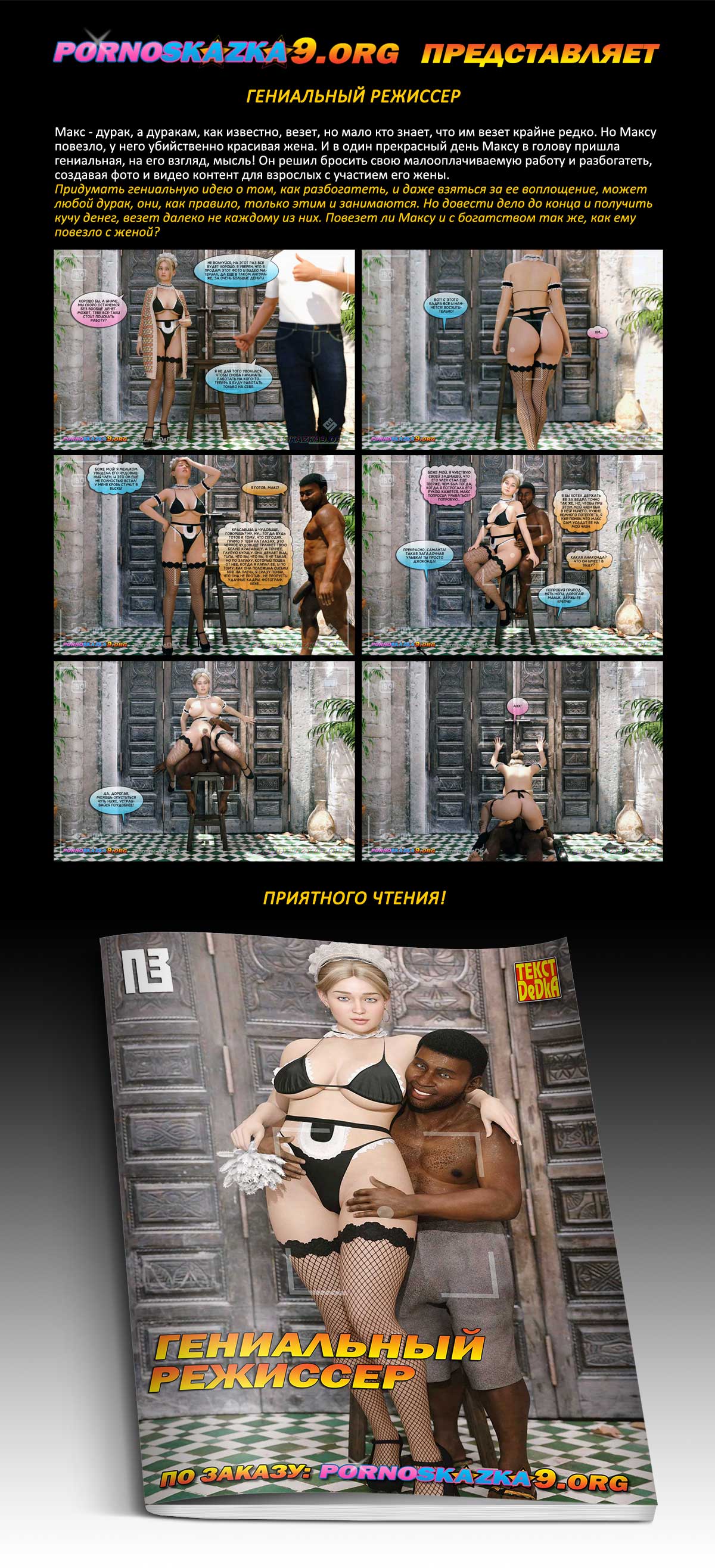 Порно комикс «Гениальный режиссер.» Макс — дурак, а дуракам, как известно, везет, но мало кто знает, что им везет крайне редко. Но Максу повезло, у него убийственно красивая жена. И в один прекрасный день Максу в голову пришла гениальная, на его взгляд, мысль! Он решил бросить свою малооплачиваемую работу и разбогатеть, создавая фото и видео контент для взрослых с участием его жены.